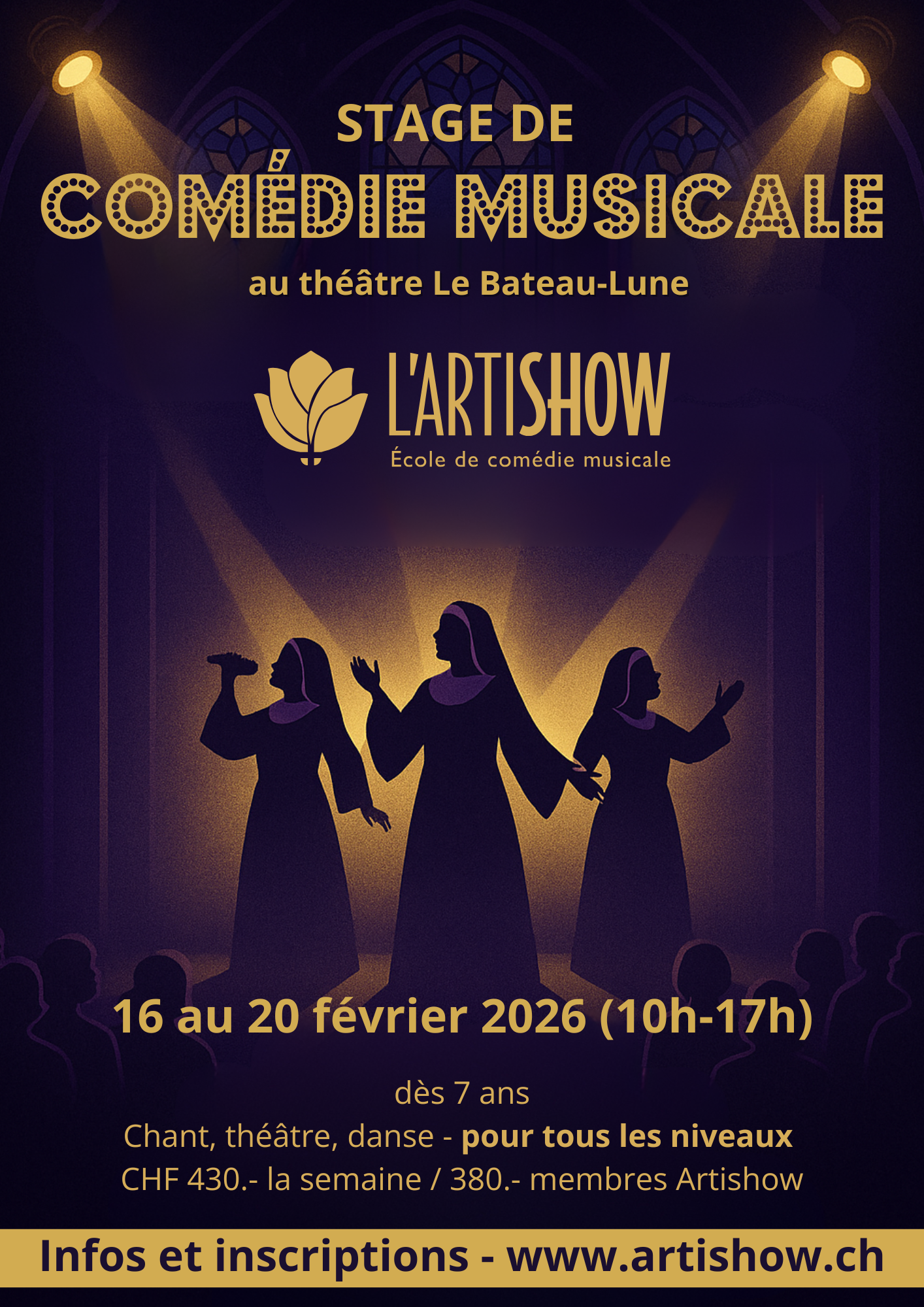Plonge dans l'univers fascinant de la comédie musicale avec nos stages d'une semaine à Cheseaux! Ces stages intensifs te permettront de travailler sur tous les aspects de la comédie musicale: chant, danse, et jeu d'acteur. Tu auras l'occasion de développer tes compétences, d'apprendre de nouvelles techniques et de participer à une production de comédie musicale en fin de semaine. Relève le challenge et vis une expérience inoubliable et épanouissante !